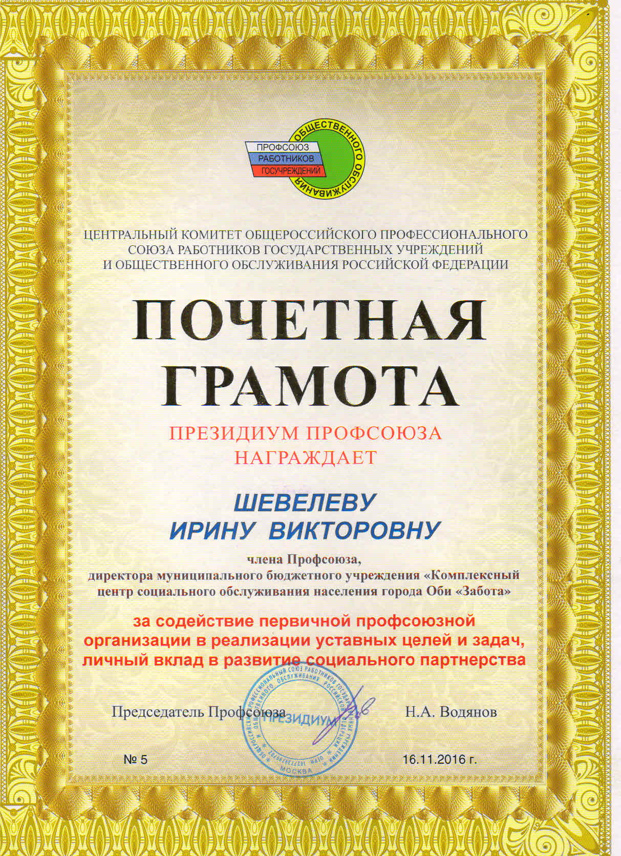Почетной грамотой председателя Федерации профсоюзов Новосибирской области